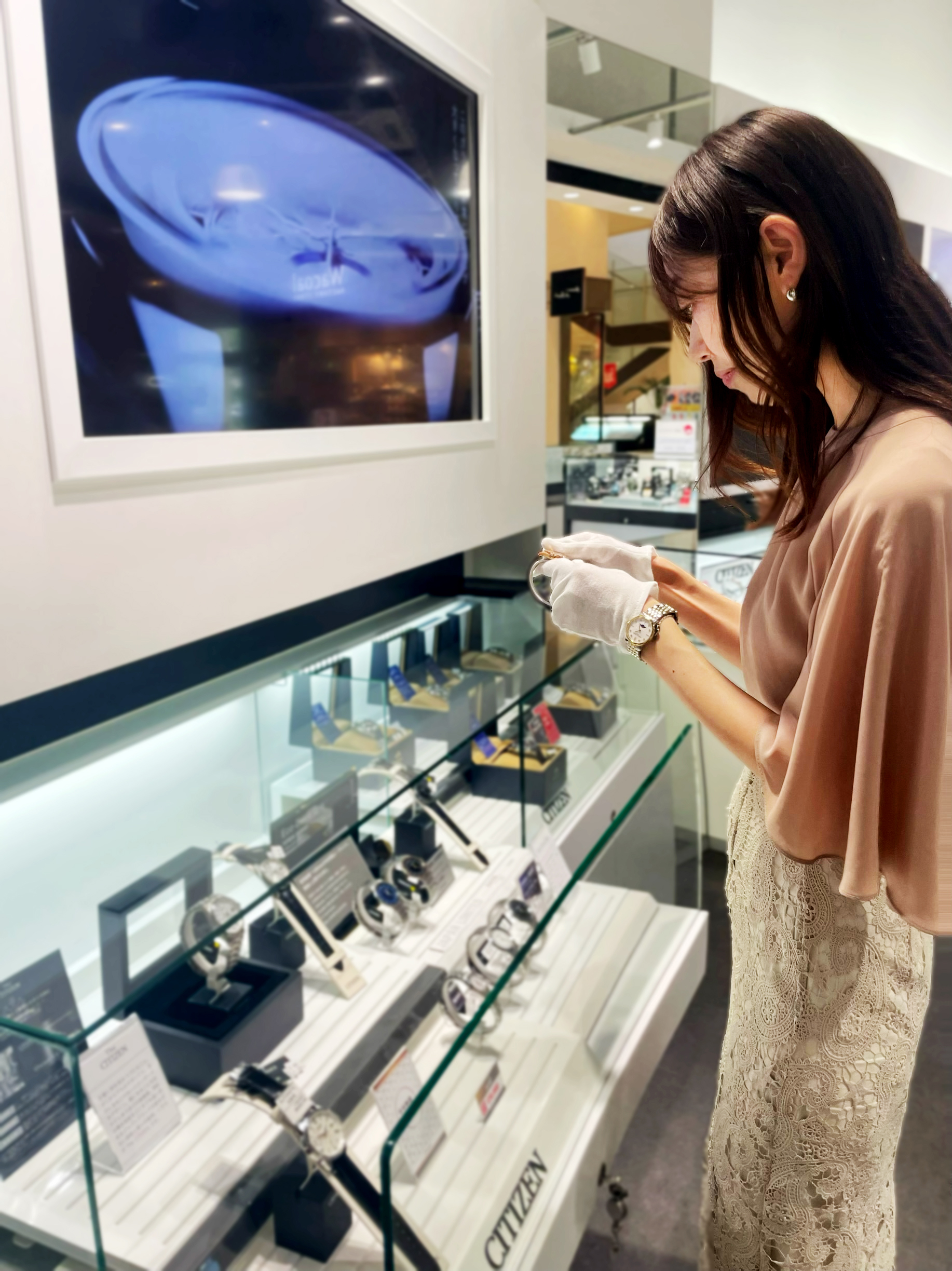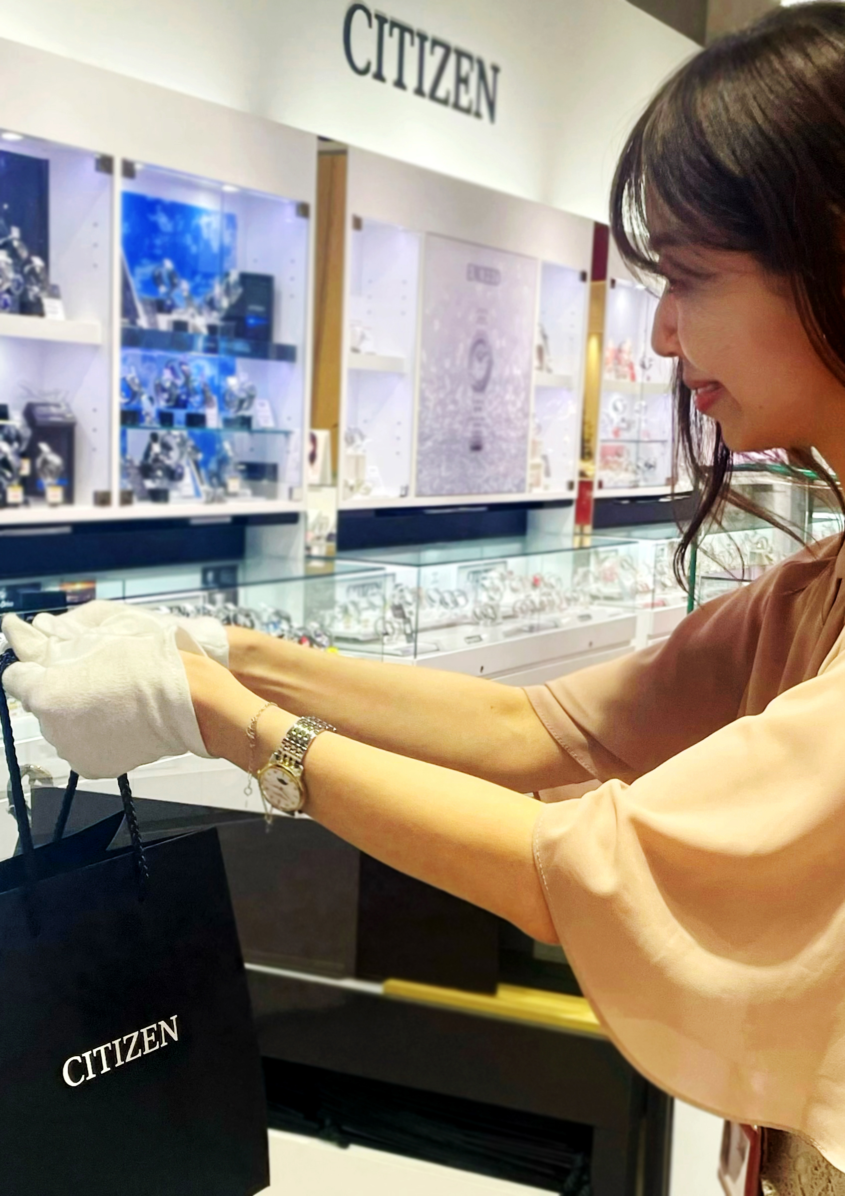 前職では化粧品や雑貨を扱う店で勤務しており、その中で時計も扱っていました。もともと接客が好きだったのですが長く働ける職場を探していてCITIZENの求人を見つけ応募しました。入社してからは時計の接客にやりがいを感じて続けることができ、店長やエリアマネージャーに背中を押され店長になることができました。店長の仕事は自分には向いていないと思っていたのですが、店長になって初めて感じる事や発見が多く、自分の成長に繋がったので感謝しています。